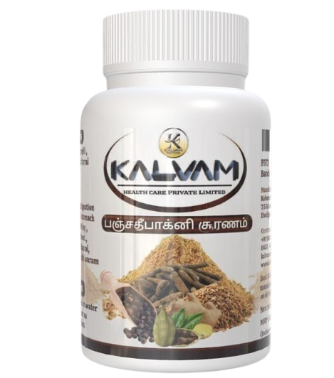 Panchadeepakini Chooranam is a traditional herbal remedy that combines a blend of potent ingredients like Chukku (dry ginger), Milagu (black pepper), Thippili (long pepper), Elam (cardamom), Seeragam (cumin), and Sarkkarai Velam Pisin (jaggery gum). This formulation is specifically designed to aid in alleviating digestive issues such as biliousness, colic, indigestion, excessive gas, loss of appetite, vomiting, and giddiness. It is also helpful in treating conditions related to internal heat and balancing the body’s humors, including Moolavayu, Kabanoi, Vayu, Piththa Vayu, Asthi Suram, and Asthivettai. Panchadeepakini Chooranam offers a natural solution to maintain digestive health and overall well-being.